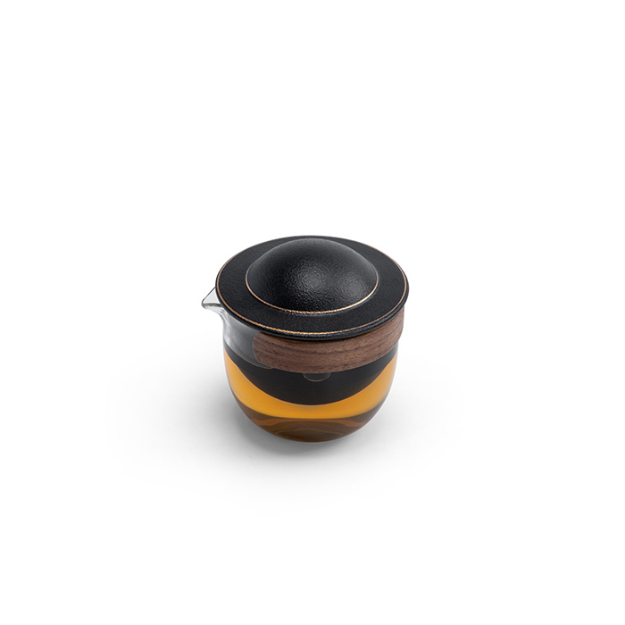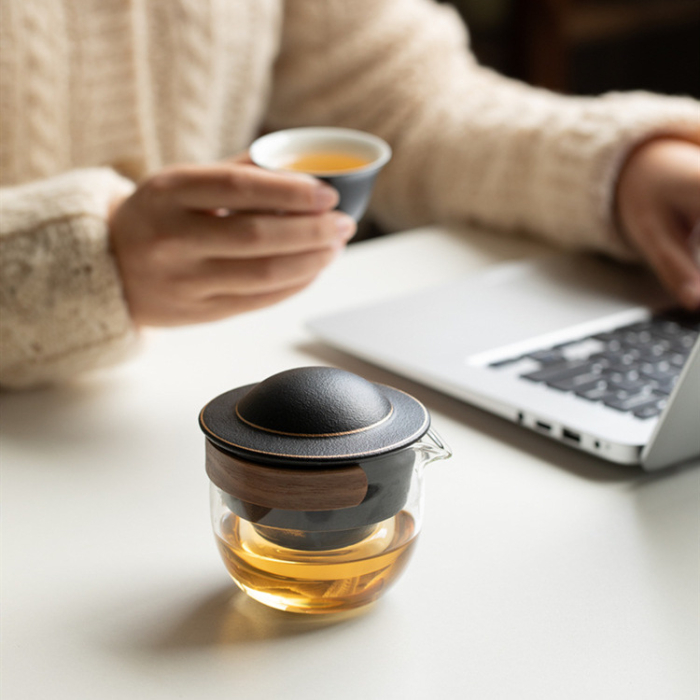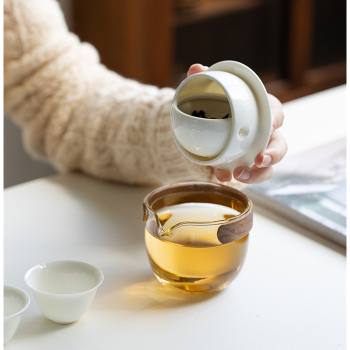 This tea set is made from 3 different materials, yet they beautifully match: ceramic, glass and wood.