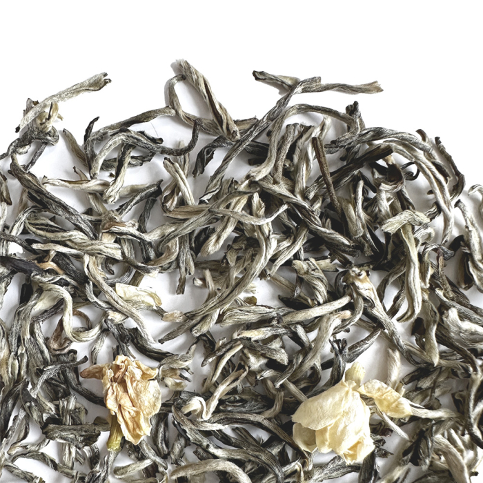 The best Chinese jasmine green teas are produced in the province of Fujian. The jasmine flowers are grown at high elevations in the mountains in the east and north part of the province. When making the Imperial Jasmine green tea, the leaves is carefully layered with fresh blooms, which will open and release their scents to the tea. In the morning, the flowers are removed and the process is repeated again that evening. This happens several nights in a row, until the tea master has the aroma balanced just right.