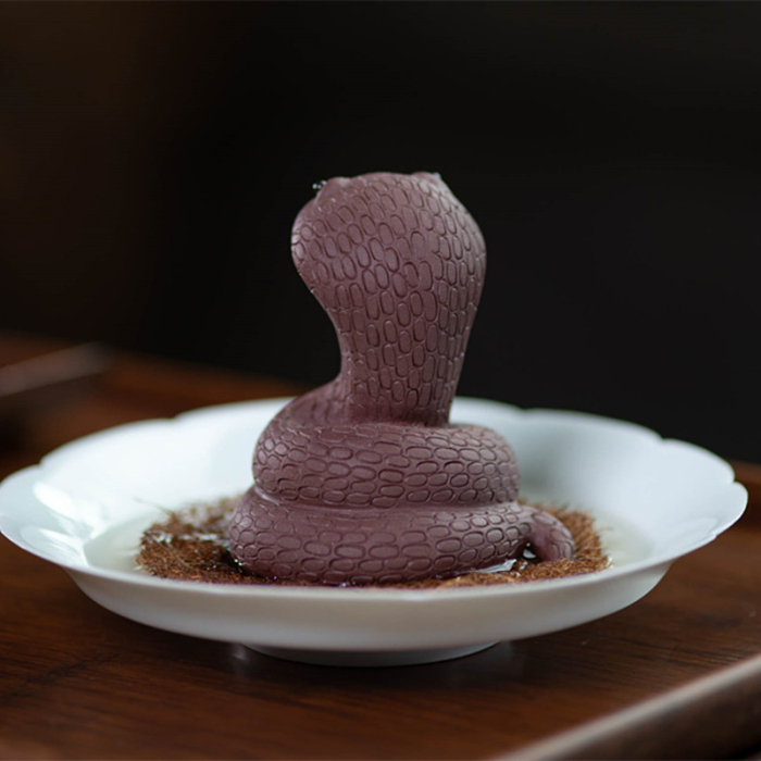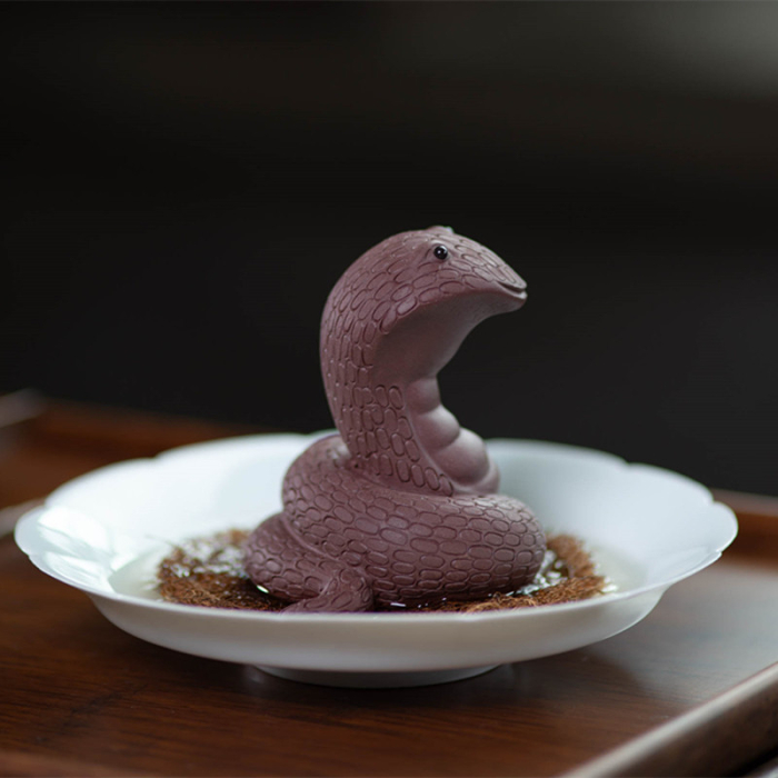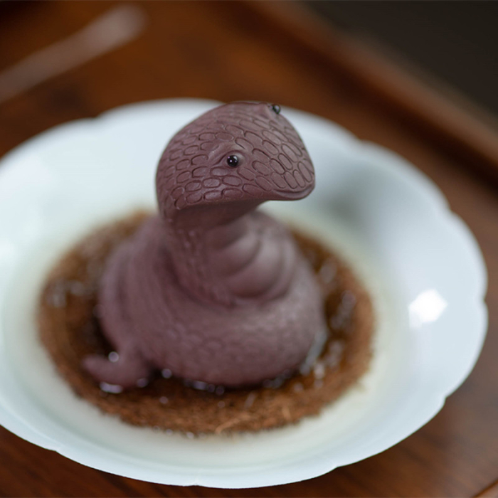This adorable snake tea pet is handcrafted from authentic purple clay (Zi Ni). Its charming smile and detailed design make it the perfect addition to your tea table, adding warmth and personality to your tea sessions.