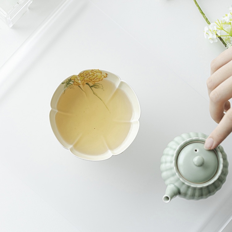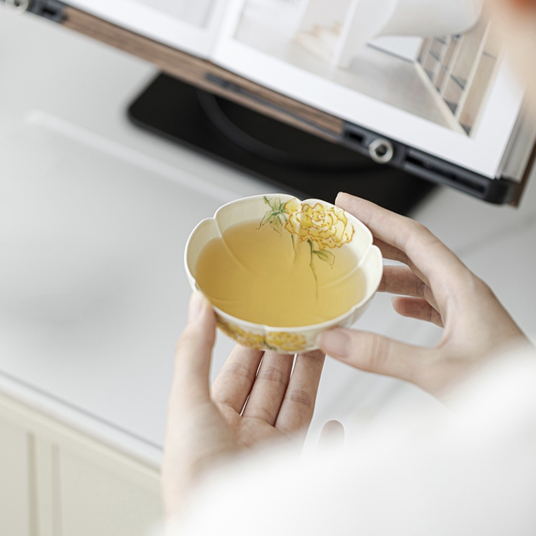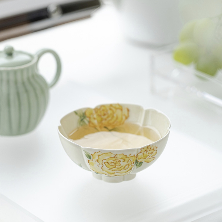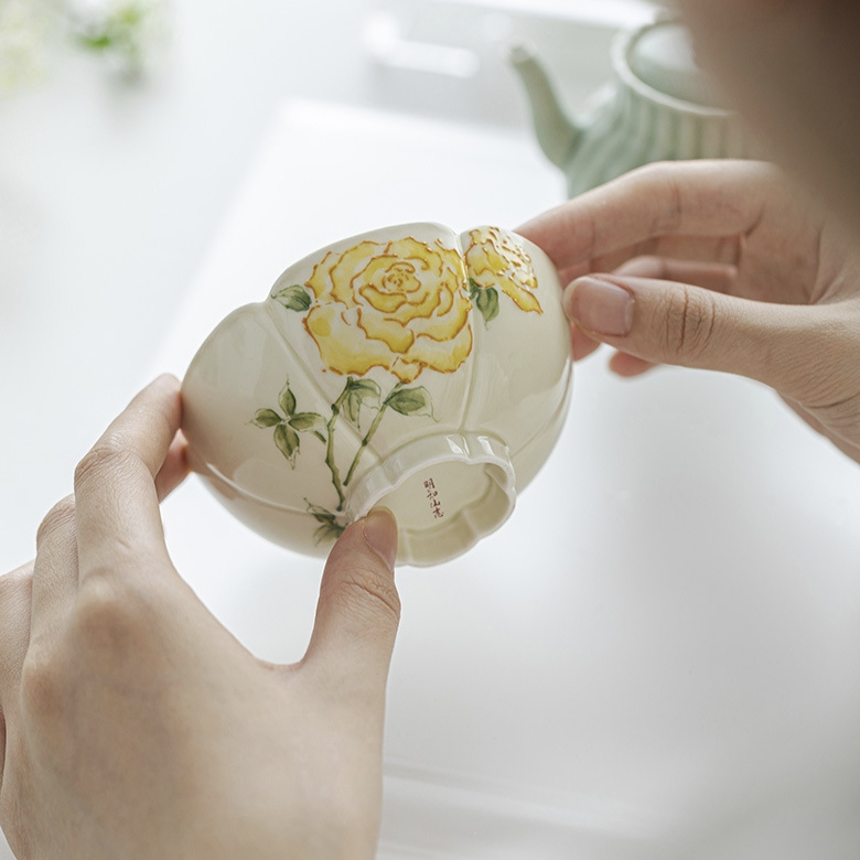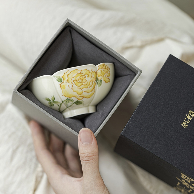 This stunning gongfu tea tasting cup is shaped like a flower and features beautifully hand-painted yellow roses inside and out. Packaged in a stylish gift box, it’s a perfect gift for any tea lover. Made by the ‘Mingzhi Mountain Records’ art studio.